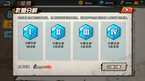 如果你有不需要的涂鴉,同樣是點(diǎn)擊涂鴉工廠選擇不需要的涂鴉,點(diǎn)擊右下角的分解按鈕就可以分解成一定數(shù)量的涂鴉噴漆,等級(jí)越高的涂鴉分解出的涂鴉噴漆就越多。
