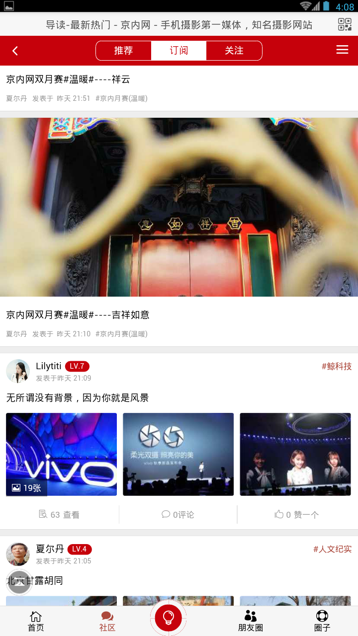 京內(nèi)在線app是一款攝影攝像應(yīng)用,是河南永欣實(shí)業(yè)有限公司打造的手機(jī)攝影服務(wù)平臺。通過京內(nèi)在線app你可查閱攝影資訊信息,了解論壇熱門話題和活動(dòng)信息,以及觀看優(yōu)質(zhì)的攝影作品和技巧信息。