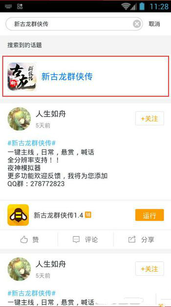 3、登錄游戲蜂窩賬號(hào)之后,點(diǎn)擊首頁(yè)右上角的搜索按鈕,然后在搜索框中輸入“新古龍群俠傳”,點(diǎn)擊搜索結(jié)果中的“新古龍群俠傳”進(jìn)入專區(qū);