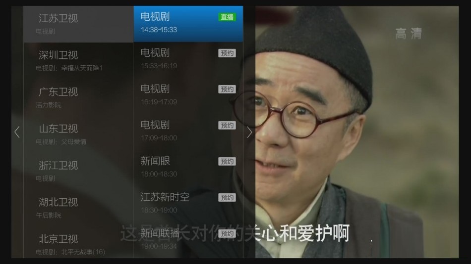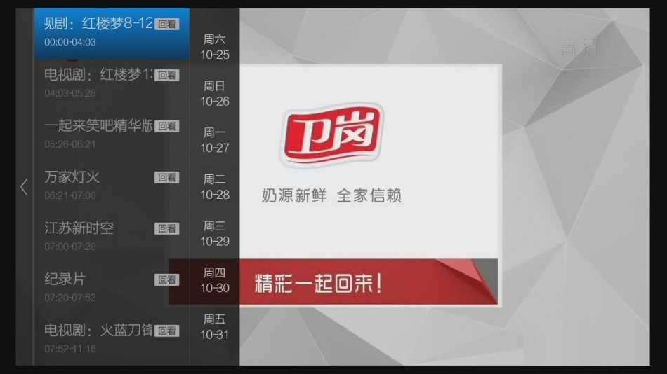 全屏播放中按遙控器的OK鍵,顯示當天的當前頻道的所有節(jié)目,按OK鍵選擇播放。