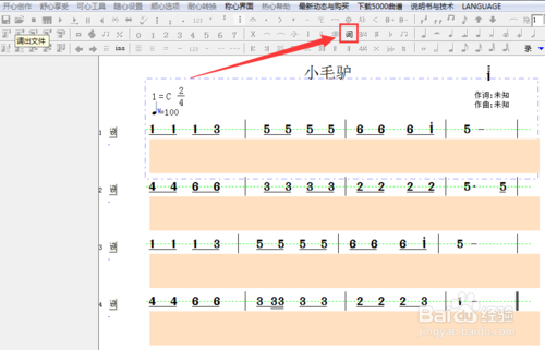 輸完以后,單擊“詞”按鈕退出編輯狀態(tài)?,F(xiàn)在作品的譜和詞都做好了,就要開(kāi)始準(zhǔn)備輸出作品了。