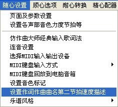 更改節(jié)拍方法。默認(rèn)的節(jié)拍是4/4拍,由于《小毛驢》是2/4拍,所以要改一下。如何改節(jié)拍呢?單擊隨心設(shè)置,選擇設(shè)置各聲部音色力度節(jié)拍等,彈出聲部設(shè)置菜單。