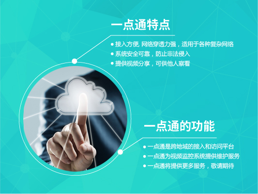 一點(diǎn)通使用簡單方便,無須任何專業(yè)知識即可安裝使用。設(shè)備聯(lián)入互聯(lián)網(wǎng)并開機(jī),即自動完成注冊; 訪問一點(diǎn)通網(wǎng)站免費(fèi)注冊用戶,通過設(shè)備密碼驗(yàn)證即可完成設(shè)備添加。 設(shè)置完成后在瀏覽器和移動設(shè)備上使用一點(diǎn)通的用戶名和密碼即可訪問自己的設(shè)備。一點(diǎn)通云服務(wù)平臺提供了設(shè)備管理、視頻查看、視頻分享和設(shè)備運(yùn)行狀態(tài)監(jiān)控等服務(wù),為用戶徹底解決后顧之憂, 平臺同時(shí)提供了錄像檢索和備份功能,方便用戶的訪問。