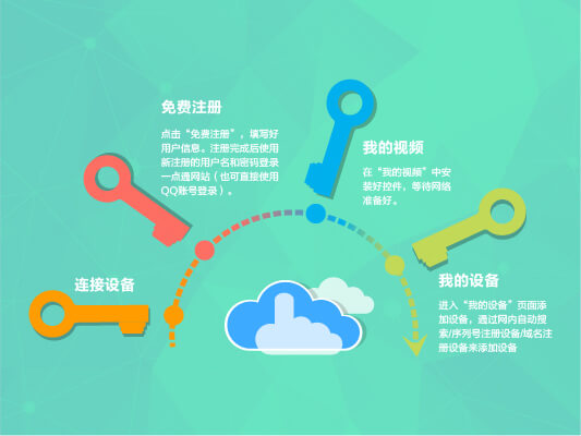 首次連接好設(shè)備,然后使用電腦訪問一點(diǎn)通網(wǎng)站,點(diǎn)擊“免費(fèi)注冊”,填寫好用戶信息。注冊完成后使用新注冊的用戶名和密碼登錄一點(diǎn)通網(wǎng)站。在“我的視頻”中安裝好控件,等待網(wǎng)絡(luò)準(zhǔn)備好后,進(jìn)入“我的設(shè)備”頁面添加設(shè)備,通過網(wǎng)內(nèi)自動搜索/序列號注冊設(shè)備/域名注冊設(shè)備來添加設(shè)備, 設(shè)備添加完成后即可在瀏覽器或移動設(shè)備上使用一點(diǎn)通的賬號訪問自己賬號下的設(shè)備。如果您有QQ賬號,可以直接使用QQ賬號登錄,無需注冊用戶,一點(diǎn)通使用騰訊網(wǎng)站驗(yàn)證,只得到您的昵稱,安全有保障。