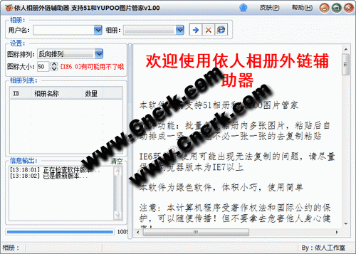 依人相冊(cè)外鏈輔助器 V1.00 簡(jiǎn)體中文綠色免費(fèi)版 批量復(fù)制相冊(cè)內(nèi)多張圖片,粘貼后自動(dòng)排成一豎,再也不必一張一張的去復(fù)制粘貼 IE6環(huán)境下使用可能出現(xiàn)無(wú)法復(fù)制的問(wèn)題,請(qǐng)盡量保證瀏覽器版本為IE7以上 本軟件為綠色軟件,體積小巧,使用簡(jiǎn)單