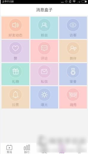 4、在消息盒子界面,為你提供了好友動(dòng)態(tài),分享,訪(fǎng)客,贊,評(píng)論,舞伴,禮物,私信,榮耀,拉票,曝光,嗨秀等信息,