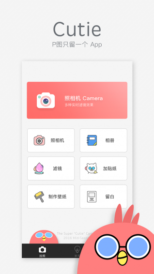 Cutie相機是一款功能非常強大的P圖軟件。想讓你的照片p得更好看,像專業(yè)攝影師拍出來的一樣嗎?Cutieapp上有多種濾鏡,海量貼紙、素材,讓你的照片更生動、更有趣!【軟件特點】
