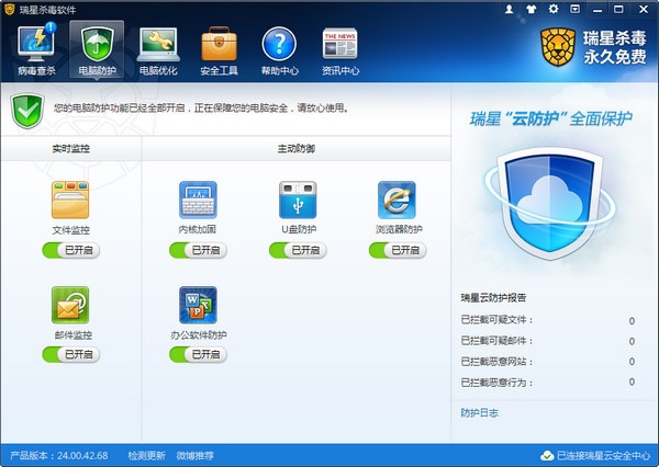 1、。病毒防御:主要監(jiān)控通過文件和郵件傳播的病毒,監(jiān)控注冊表和網(wǎng)絡(luò),防止病毒傳播。