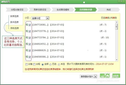 ③ 如果您選擇自助選房:系統(tǒng)會(huì)收入你推送的35條房源,可以自由挑選刷新,一般我都是使用自助選房,選擇最優(yōu)質(zhì)的房源進(jìn)行滾動(dòng)式刷新.設(shè)置好自助選房后點(diǎn)擊右下角的保存