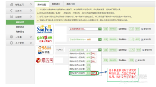 完成第5步保存后,系統(tǒng)會(huì)跳到刷新設(shè)置界面,找到我們剛才設(shè)置的刷新計(jì)劃,點(diǎn)擊啟動(dòng)。就表示我們的刷新計(jì)劃已經(jīng)啟動(dòng).(需要提醒的是:云刷新設(shè)置后,取消網(wǎng)站預(yù)約和手動(dòng)刷新,避免資源浪費(fèi))