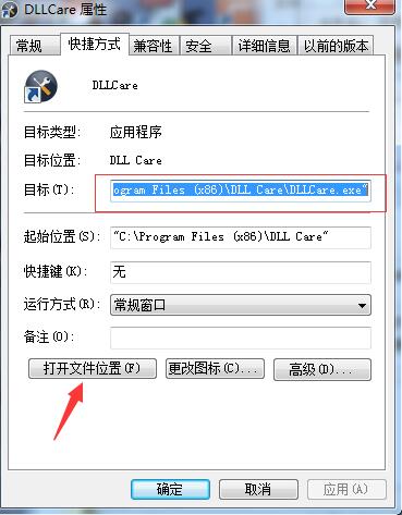 1、按照以上方法安裝DLL CARE,安裝完成后先不要運行軟件2、鼠標(biāo)右擊DLL CARE快捷圖標(biāo),點擊“屬性”——“打開文件位置”