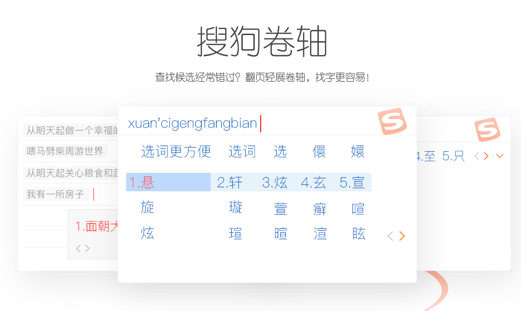 搜狗卷軸:您在找字時會不會經(jīng)常錯過藏在候選中的“它”呢?現(xiàn)在,翻頁輕展卷軸,就能“一覽眾候選”,找字更容易。