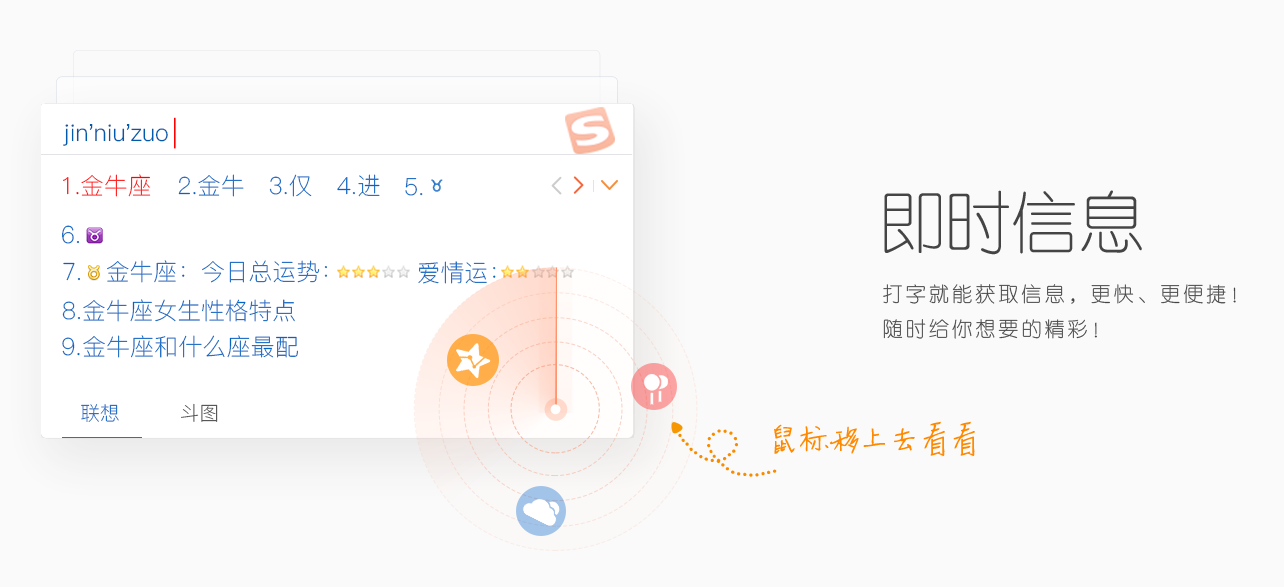 情景感知:搜狗將根據(jù)您當前所處的情景,智能地調(diào)整候選排序,輕按空格就能讓您馬上打出想要的文字!(僅支持IE內(nèi)核瀏覽器)文思泉涌:輸入詩詞,按下空格或標點后,搜狗立刻為您展示詩詞下句,讓您輕松寫作!還有一些驚喜等您去發(fā)現(xiàn)哦!