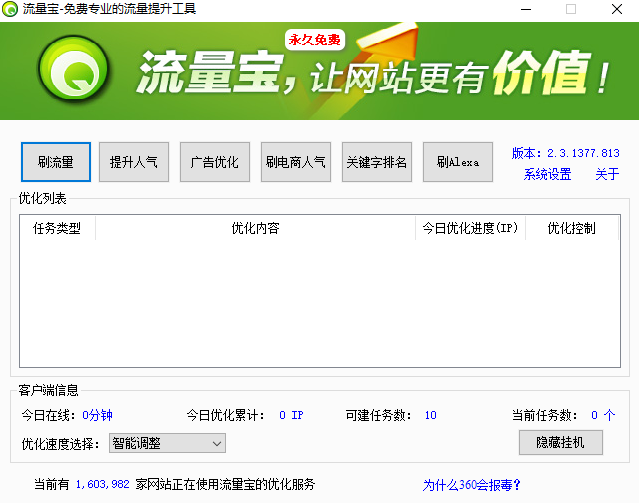 1、綠色免費(fèi):流量寶是一款綠色軟件,無需注冊。只需下載到桌面上直接運(yùn)行,永久免費(fèi)。2、操作簡單:運(yùn)行軟件,輸入要優(yōu)化的網(wǎng)址,點開始優(yōu)化即可。