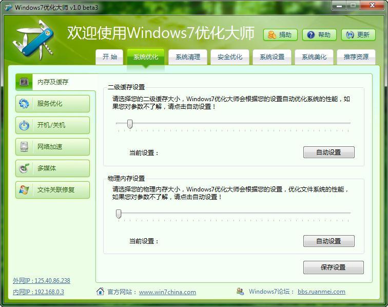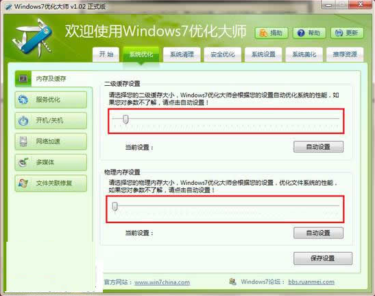 在頁面上單擊“系統(tǒng)優(yōu)化”菜單,在彈出的對話框中,左側(cè)有關(guān)于系統(tǒng)優(yōu)化的相關(guān)子項目,包括“內(nèi)存及緩存、服務優(yōu)化、開機/關(guān)機、網(wǎng)絡”等等在內(nèi)存及緩存中,用戶可根據(jù)實際的電腦配置對其進行調(diào)節(jié),如若用戶不是很清楚此項的功能意義,那么單擊“自動設置”軟件會自動幫你完成此操作的