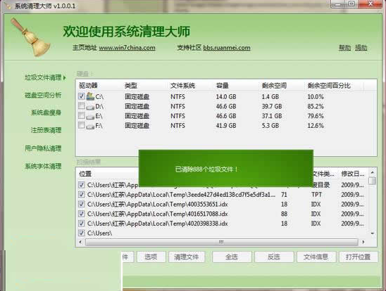 在經(jīng)過一段時間的文件檢查后,用戶即可對所查出的文件進行清理了,簡單的點下“清理文件”即可