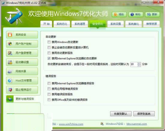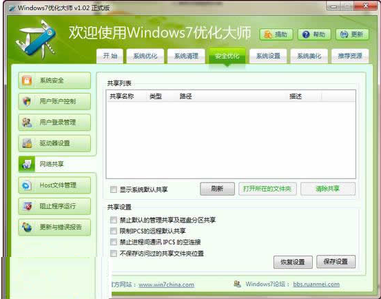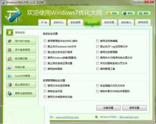 雖說win7的安全系數(shù)相比之前的任何一個Windows版本都來的高,但實際上,如何更好的優(yōu)化自己的安全防護措施也是一個必要的課題,好在Windows7優(yōu)化大師有相當全面的安全優(yōu)化方案供用戶選擇使用這其中包括了“用戶賬戶控制、用戶登錄管理、網(wǎng)絡共享、host文件管理”等多種功能項
