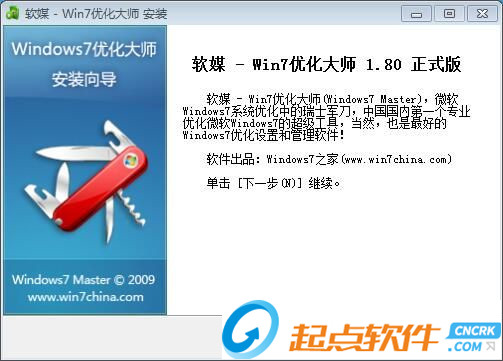 首先我們將Windows7優(yōu)化大師下載到電腦中,將下載得到的壓縮文件解壓后雙擊安裝文件“windows7mastersetup_1.80.exe”出現(xiàn)安裝界面: