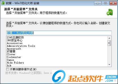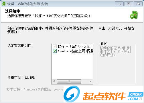 選擇你想要安裝“軟媒 - Win7優(yōu)化大師”的那些功能。勾選你想要安裝的組件,并解除勾選你不希望安裝的組件。 我們可以選擇軟媒 - Win7優(yōu)化大師、Windows7極速上網(wǎng)。點擊安裝開始安裝進程;