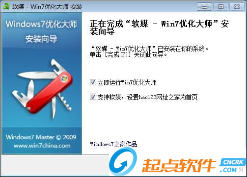 安裝完成!安裝程序已經(jīng)成功在您的電腦上安裝了Windows7優(yōu)化大師。安裝向?qū)崾景惭b完成。這里有兩個勾選項,立即運行Win7優(yōu)化大師和支持軟媒,設置hao123網(wǎng)址之家為首頁。如果需不需要執(zhí)行,取消勾選即可。點擊完成即可退出安裝向?qū)А?br />
