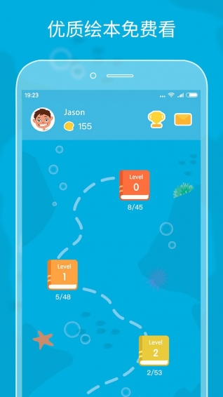 4、成就系統(tǒng),通過(guò)聽(tīng)老師繪本&自己讀繪本,免費(fèi)獲得星星,兌換“專(zhuān)屬成就”