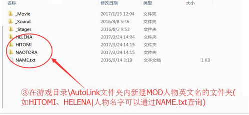 3.在游戲目錄AutoLink文件夾內(nèi)新建MOD人物英文名的文件夾(如HITOMI、HELENA|人物名字可以通過NAME.txt查詢)