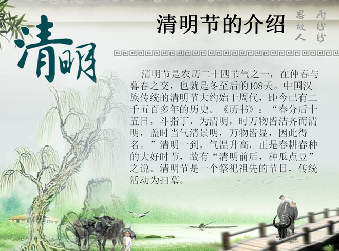 清明節(jié)ppt課件是一個關(guān)于清明節(jié)的中國風(fēng)PPT模板,詳細(xì)的介紹了清明節(jié)的來源,清明節(jié)的典故、清明節(jié)的詩詞、清明節(jié)的傳說等等內(nèi)容,以及插柳、蕩秋千、踏青等傳統(tǒng)習(xí)俗活動,可以用來作為教學(xué)課件使用。