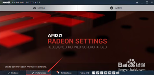 2、開啟顯卡設(shè)置窗口往往需要較長(zhǎng)的時(shí)間,等待一會(huì)就會(huì)彈出AMD顯卡的設(shè)置窗口,我們?cè)谙路竭x擇“Preferences”,進(jìn)入顯卡參數(shù)設(shè)置。