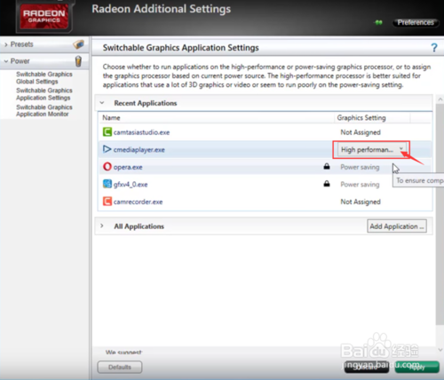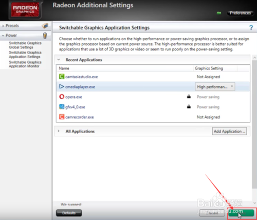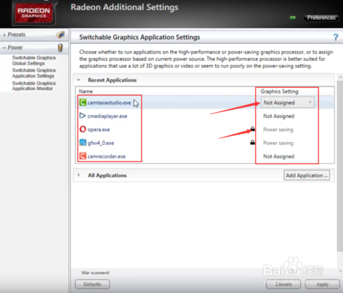 4、在此設(shè)置頁(yè)面,我們可以在主窗口的左側(cè)位置,看到我們常使用的應(yīng)用程序,在右側(cè)則是AMD顯卡當(dāng)前的設(shè)置,可以看到多數(shù)都是無(wú)設(shè)置,或者“power saving”省電模式。