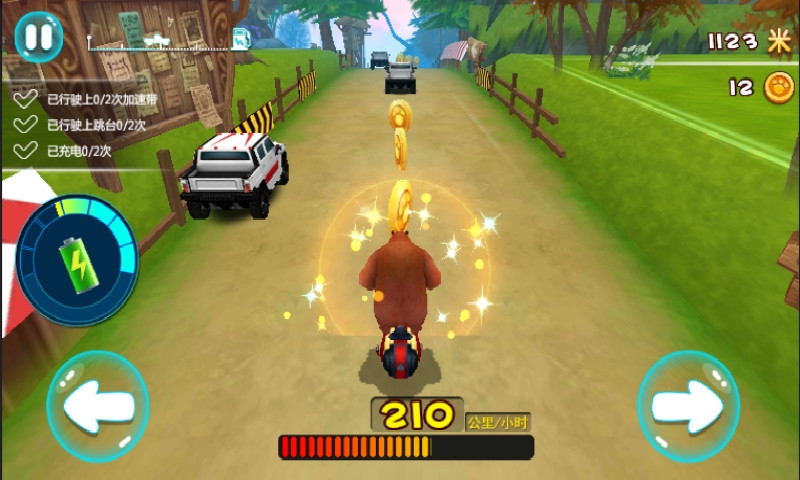 選擇角色和坐騎進(jìn)入游戲競速畫面,點(diǎn)擊左右下方的按鈕來控制角色左右移動(dòng)