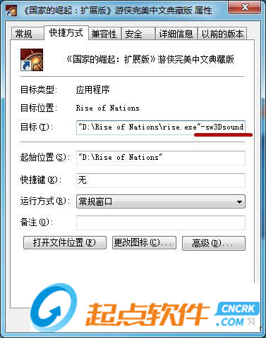 “F:\Game\Rise of Nations\rise.exe” -sw3Dsound 就好了。