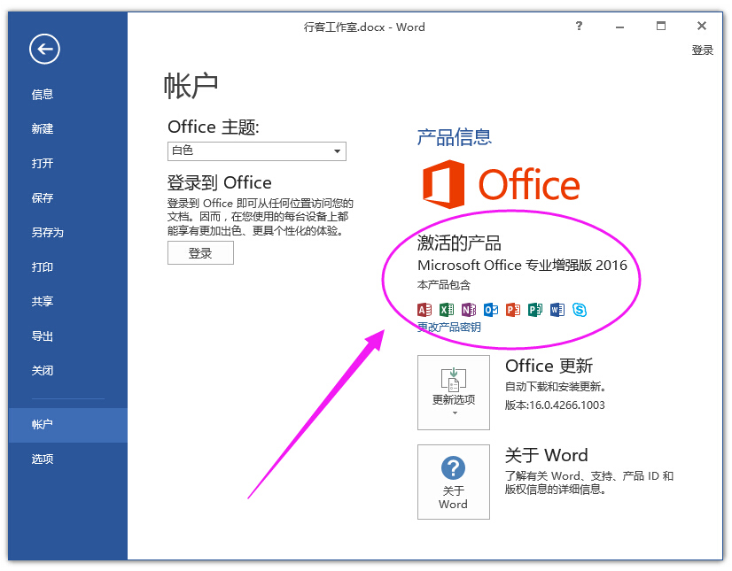 3、怎么檢測(cè)Office2016是否激活了,如下圖所示,隨便打開(kāi)一個(gè)word或者excel然后點(diǎn)擊左上角的【文件】菜單,然后點(diǎn)擊開(kāi)【賬戶】,就可以看到office是否激活了。