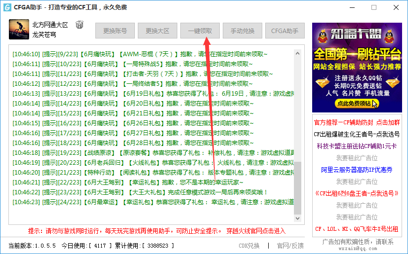 cfga助手,穿越火線最新活動一鍵領(lǐng)道具工具官方網(wǎng)站,打造專業(yè)的CF活動工具。主要功能一鍵領(lǐng)活動道具、活動列表、戰(zhàn)績查詢、CDK兌換等功能。永久免費使用!