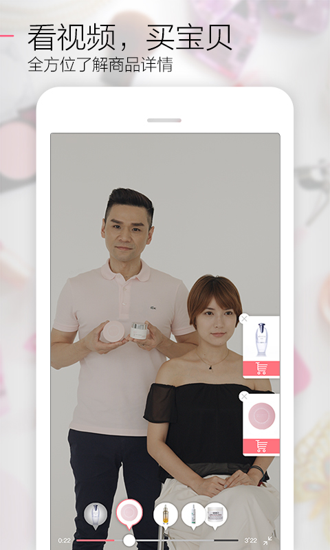 視頻全屏狀態(tài)下,將以氣泡的形式將視頻出現(xiàn)的商品展示給用戶,方便用戶一遍觀看一邊購買心儀商品。
