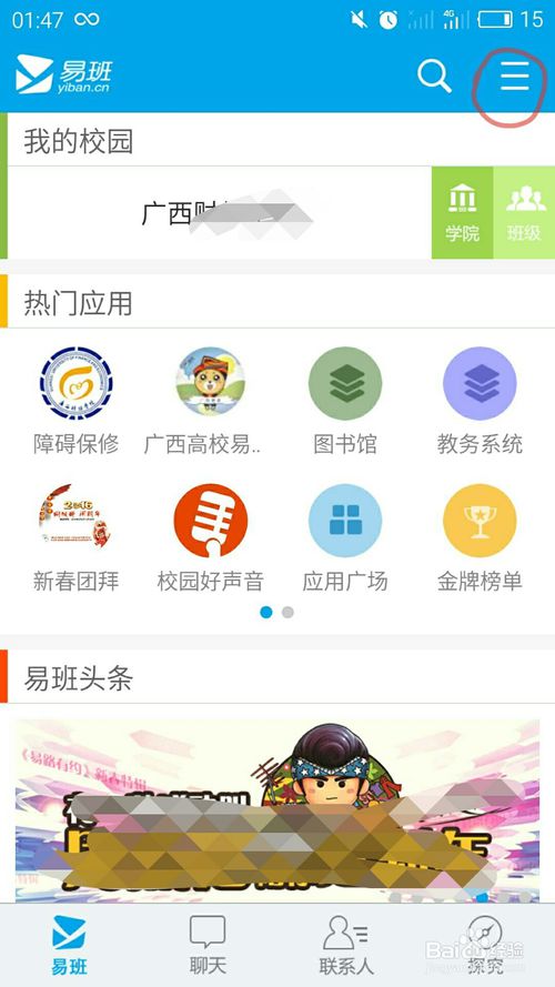 打開易班的進(jìn)入主頁,點擊右上角的三線標(biāo)志