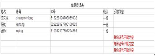 6.出現(xiàn)以上錯誤的解決方法:檢查反饋信息所對應(yīng)的姓名,姓名必須是中文漢字,不能帶有字母、數(shù)字、符號、空格鍵等,修改后保存文檔重新導(dǎo)入。