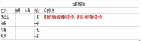 11.導(dǎo)入賬號后,點(diǎn)擊查看結(jié)果,反饋信息有提示:模板中有重復(fù)的身份證號(如下圖)。