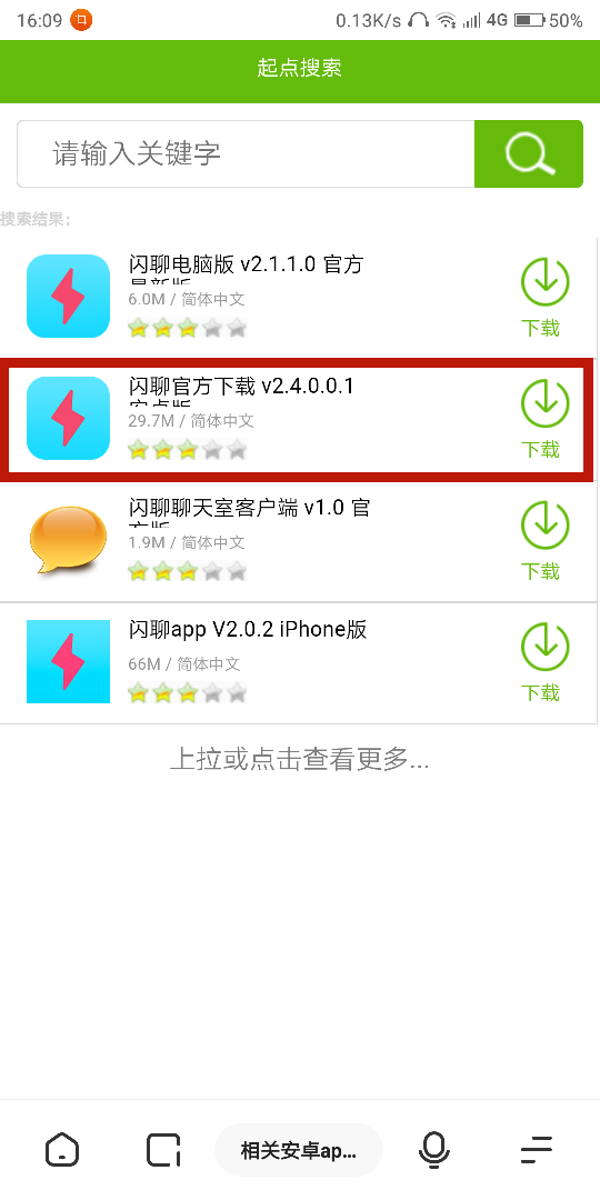 2.進(jìn)入起點(diǎn)后搜索閃聊,然后點(diǎn)擊第二個(gè)進(jìn)入下載頁面