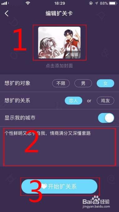 填寫“擴(kuò)關(guān)卡”步驟:登錄--發(fā)現(xiàn)--“擴(kuò)關(guān)系”--編輯擴(kuò)關(guān)卡(如圖所示)。重要的是填寫自己的封面和自我介紹(即圖中“1”和“2”)。