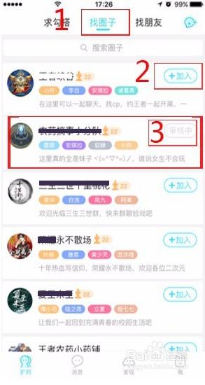 加入圈子的操作:進(jìn)入“擴(kuò)列”頁面(如圖),點(diǎn)擊找圈子(操作“1”)點(diǎn)擊加入(操作“2”),顯示“審核中”(操作“3”)后,等待圈主回復(fù)即可。