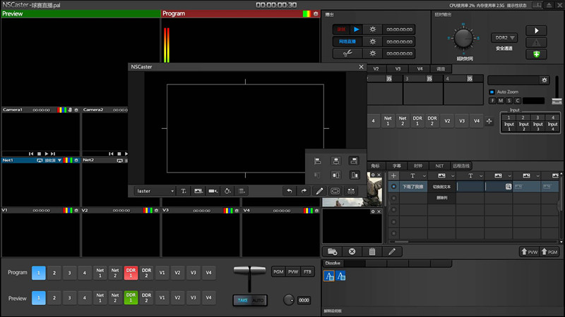 nscaster是款集三維無軌虛擬、多機(jī)位切換、錄制、播出、調(diào)音、延時、字幕、監(jiān)視為一體的全高清采編錄播一體機(jī)。引入了雙屏界面,支持雙屏同時進(jìn)行多視頻、多素材通道和音頻的控制及編輯,最高可以輸出10位的全格式4k視頻,以滿足高標(biāo)準(zhǔn)廣播級環(huán)境的需要。旨在為教育行業(yè)、政府企業(yè)、文化場所,包括體育賽事和網(wǎng)絡(luò)直播等各類活動提供完美的直播體驗(yàn)。傳統(tǒng)的直播,包括切換臺、調(diào)音臺、錄像機(jī)、編碼器等多種設(shè)備,但由于價格高昂、攜帶不便、維護(hù)繁雜、靈活性低、功能局限等缺陷,給節(jié)目制作者帶來了極大的煩惱和制約。NSCaster具備超高集成度,體積小,攜帶方便,僅需少量設(shè)備及工作人員即迅速搭建出功能齊全的專業(yè)演播室。