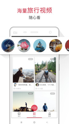 首頁(yè),觀看官方拍攝旅行視頻,畫(huà)質(zhì)高清生動(dòng),包括分享旅游經(jīng)驗(yàn)、玩裝備、看新奇等旅行興趣點(diǎn)。