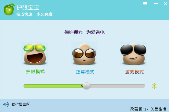 護眼寶寶是天翼工作室推出的一款輕巧快速、簡單易用且永久免費的屏幕亮度調(diào)節(jié)軟件。支持電腦保護色的設(shè)置,色彩調(diào)節(jié)后,重新載入軟件整體進度條也會改變,支持設(shè)置快捷方式,更方便的調(diào)節(jié)屏幕亮度,既可以通過模式選擇(護眼模式、正常模式、游戲模式),也可以通過滾動條自己調(diào)節(jié)屏幕亮度,非常方便.【軟件特色】
