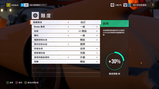 另一方面,《地平線3》有著豐富且嚴格的收益獎勵機制,用來區(qū)分入門玩家和硬核玩家。該機制就是鼓勵玩家關(guān)閉ABS、轉(zhuǎn)向輔助、行駛輔助線、倒帶模式等自己不需要的輔助功能,來增加收益的百分比。下面這張圖足以說明一切: