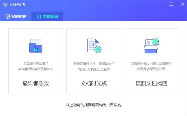 1.全新功能文檔守護(hù)者:敲詐者病毒急救、文檔時光機(jī)、誤刪除文檔找回被敲詐者病毒加密的文檔,目前幾乎無法通過技術(shù)手段得到解密