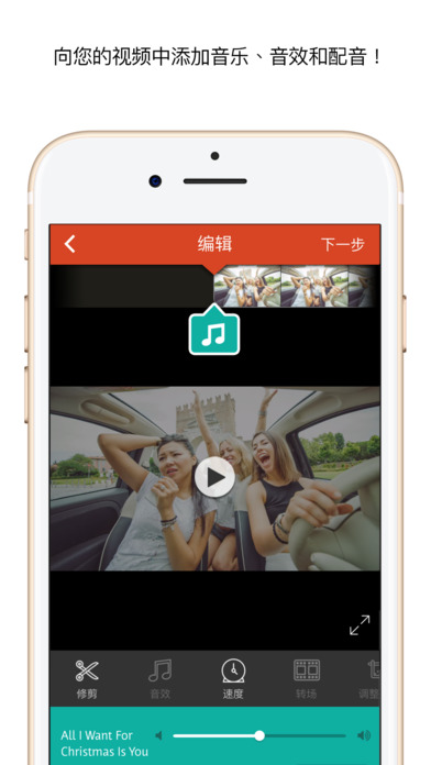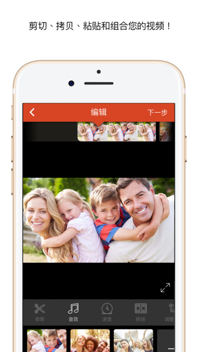 修剪:剪除任何多余瞬間。您也可將視頻分割成多個(gè)剪輯。音樂:從您的 iPod 音樂庫添加或從 Videomall 購買剪輯。