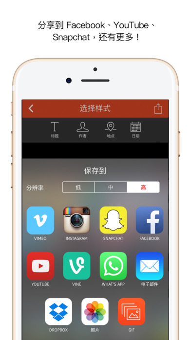 分享到 Vine、Snapchat、Instagram、Facebook、YouTube、Vimeo、Dropbox、Whatsapp 或電子郵件。
