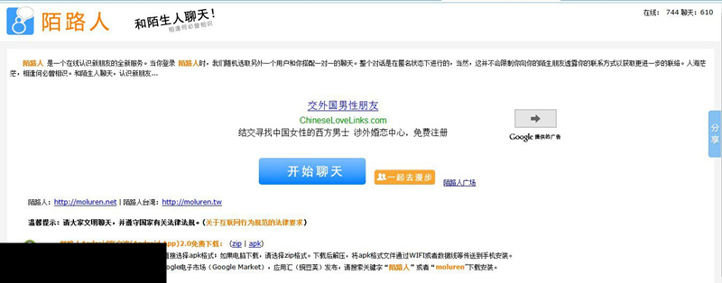 陌路人是一個在線認識新朋友的全新服務(wù)。當你登錄陌路人時,網(wǎng)站隨機選取另外一個用戶和你搭配一對一的聊天。整個對話是在匿名狀態(tài)下進行的,當然,這并不會限制你向你的陌生朋友透露你的聯(lián)系方式以獲取更進一步的聯(lián)絡(luò)。不僅僅只有即時聊天,還有陌路人廣場、一起去散步等更多與陌生人的互動服務(wù)。另外還有陌路人手機android客戶端,能讓你暢聊無限。