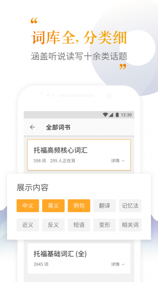 1.詞量大、詞庫全、分類細(xì)超過5000個(gè)托??键c(diǎn)單詞及500余個(gè)詞組和短語,并根據(jù)詞頻、聽說讀寫四個(gè)科目以及自然科學(xué)、人文社科等十余類話題對(duì)詞匯進(jìn)行分類,形成豐富的細(xì)分詞書;