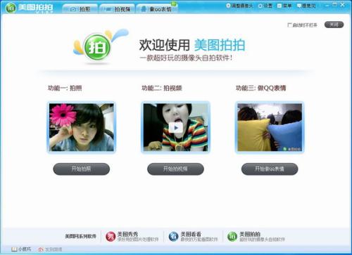 美圖拍拍是一款兼容所有主流攝像頭的自拍軟件。1秒鐘就能自拍可愛大頭貼。把電腦變成照相機(jī),輕松自拍不求人。海量邊框素材,可愛大頭貼隨心拍。實(shí)時(shí)預(yù)覽拍攝效果,真正所見即所得。還能用“美圖秀秀”處理超炫圖片特效。